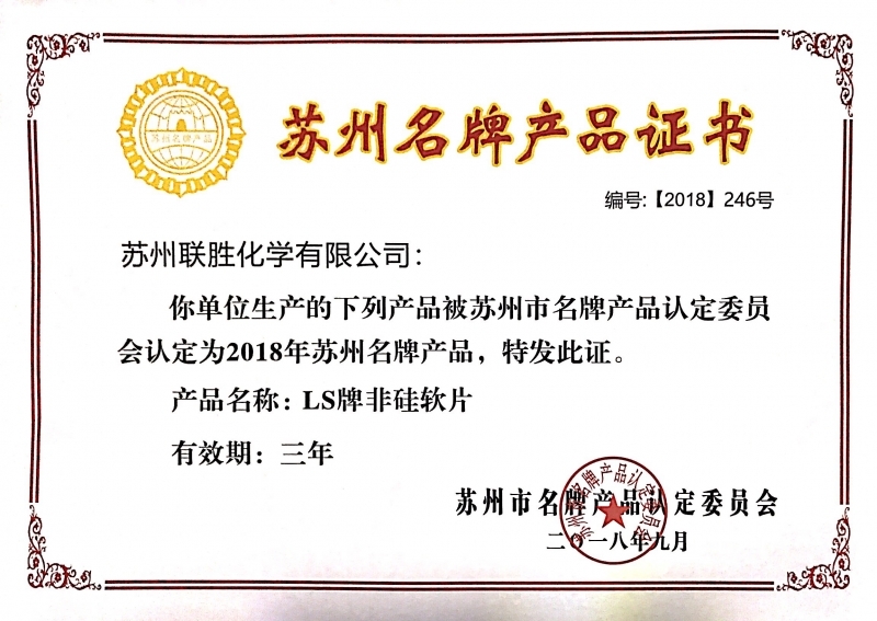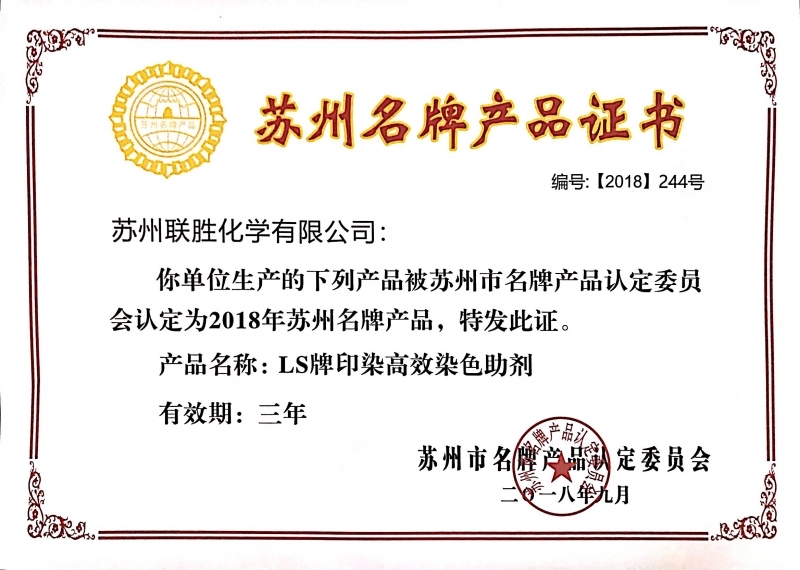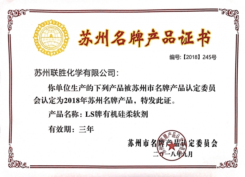 2018年10月23日,苏州市名牌产品认定委员会授予联胜产品“非硅软片”、“印染高效染色助剂”、“有机硅柔软剂”3类产品“苏州市名牌产品”荣誉称号。